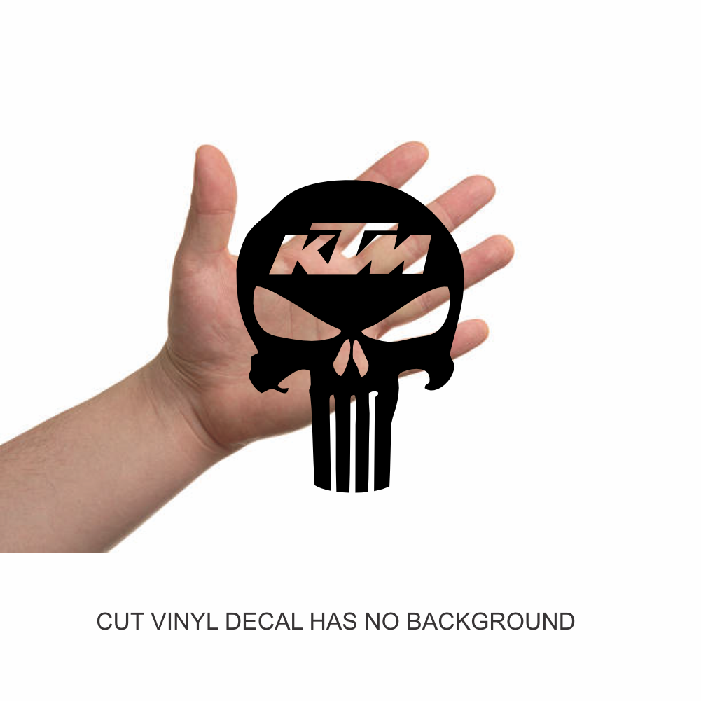 Punisher Skull KTM Racing Window Decal Sticker works great on all surfaces such as trucks, cars, laptops, walls, windows, tumblers, phones and any other surface you can think of. These decals are made from ORACAL 651 Series brand premium cut vinyl which is marine-grade and rated for 8+ years of outdoor use in harsh saltwater environments. Our custom made decals are available in a variety of sizes, colors and fonts and are made right here in America. Your order will arrive ready to install within 5 to 7 days via USPS from our shop in Miami, Florida.
